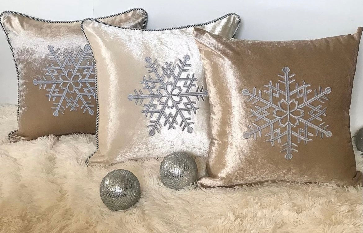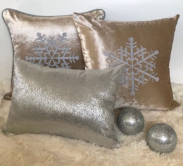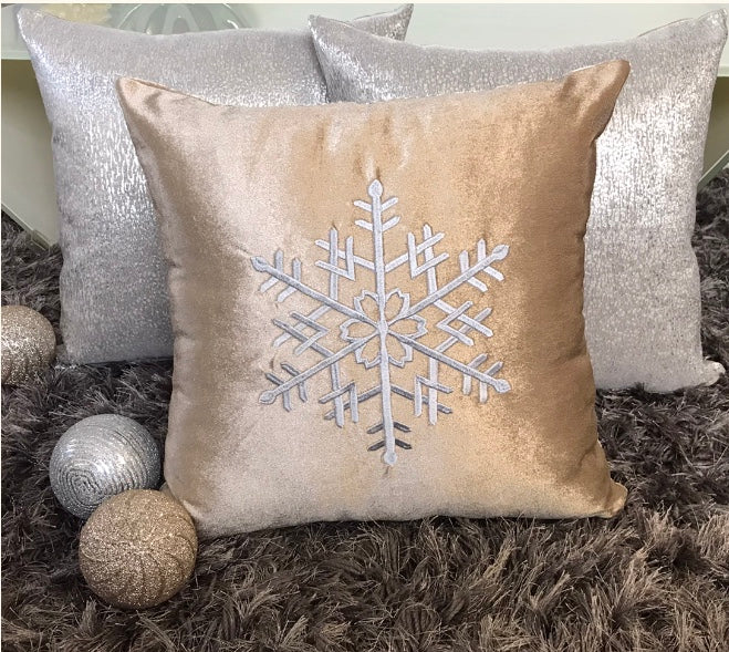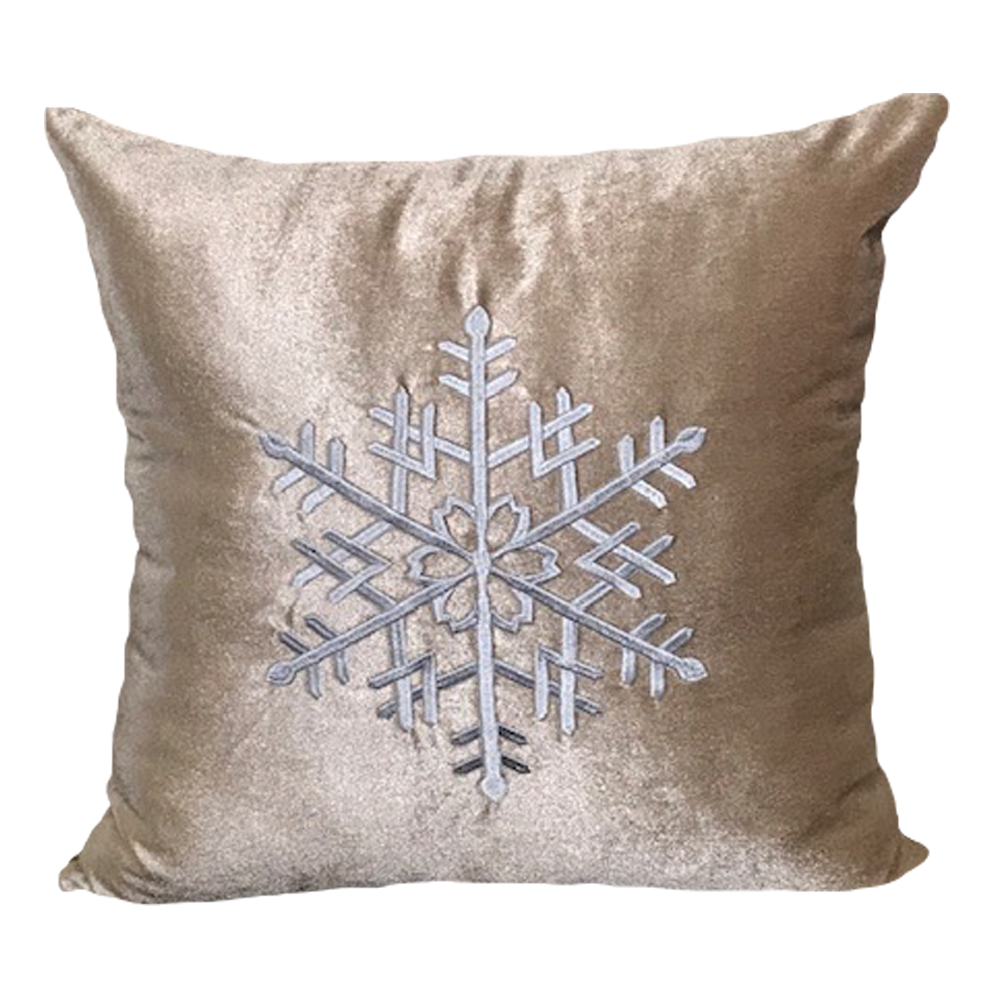 Cojín navidad color ocre copo plata, material velvet, con cordón plata, cremallera y relleno sintetico, medida 50x50.