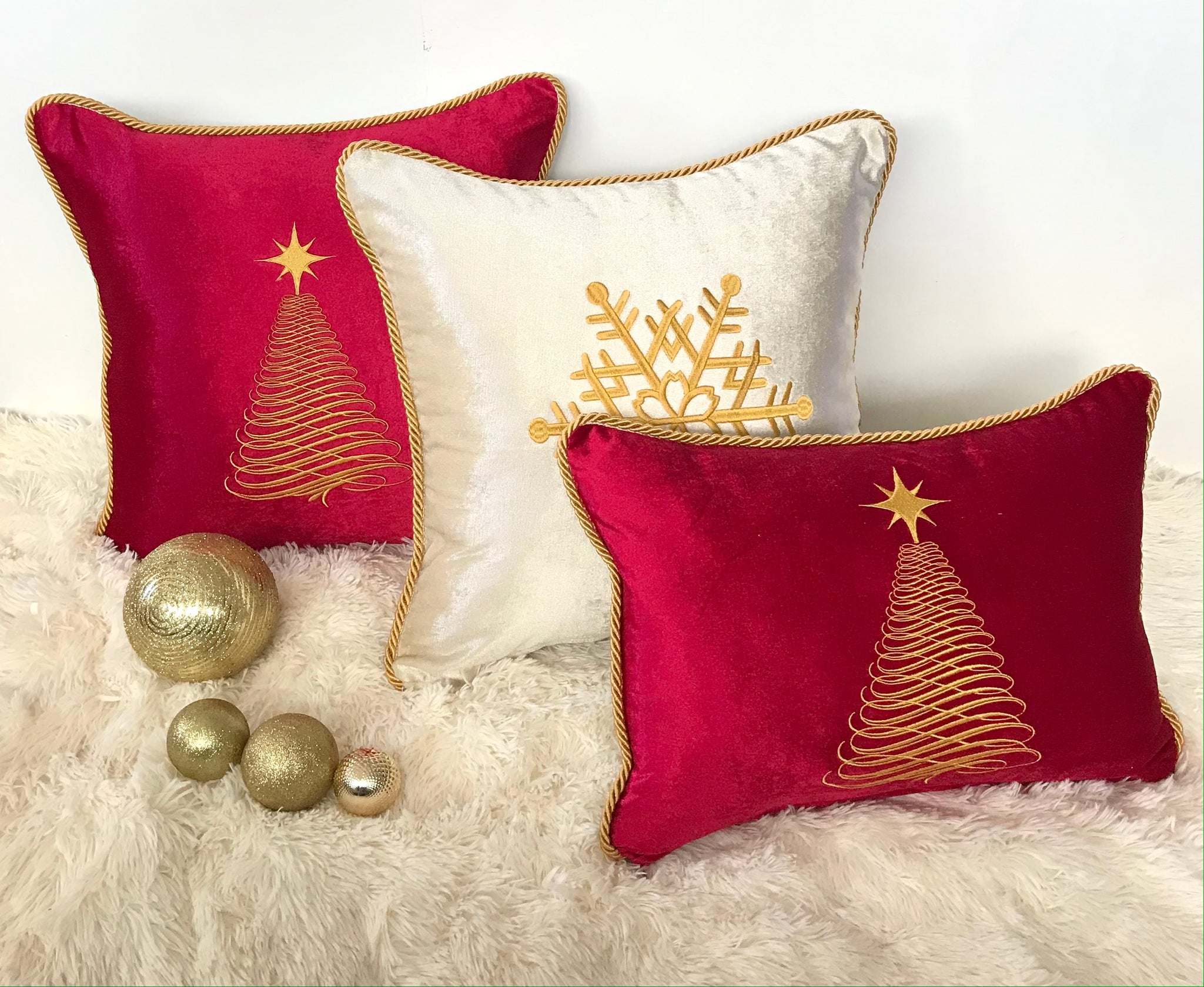 Cojín rectangular rojo en velvet, árbol dorado, cordón dorado, cremallera y relleno sintetico.