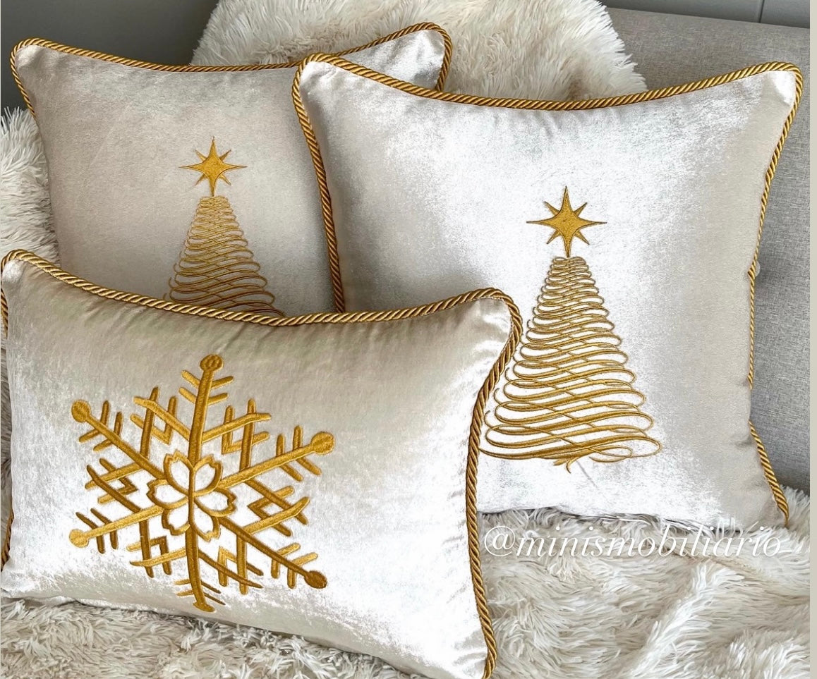 Cojín rectangular color crema árbol dorado, cordón dorado, cremallera y relleno sintetico.